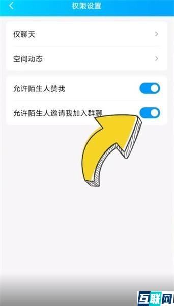 3. 点击【权限设置】,滑动按钮关闭【允许陌生人邀请我加入群聊】就可以了。