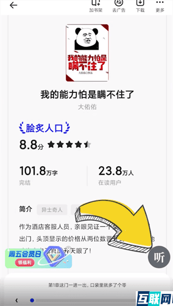 2. 点击小说进入,点击页面中间位置,点击【听】,