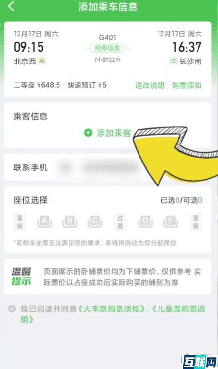 5. 点击【添加乘客】,勾选乘车人,再点击下方【确定】,就可以选择想要的座位了。