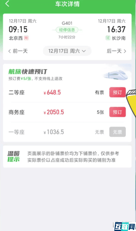 4. 选择出行的车次,点击右侧【预订】,