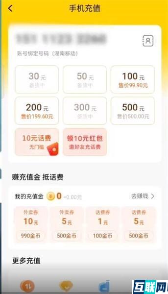 2. 在我的主页界面找到并点击【手机充值】,输入手机号码,选择充值金额就可以充值了。