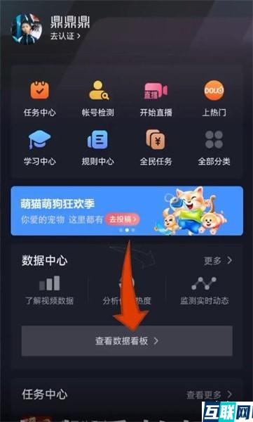 2. 在功能界面点击【创作者服务中心】,点击【数据中心】下面的【查看数据看板】,这样就可以查看账号的一些数据了。
