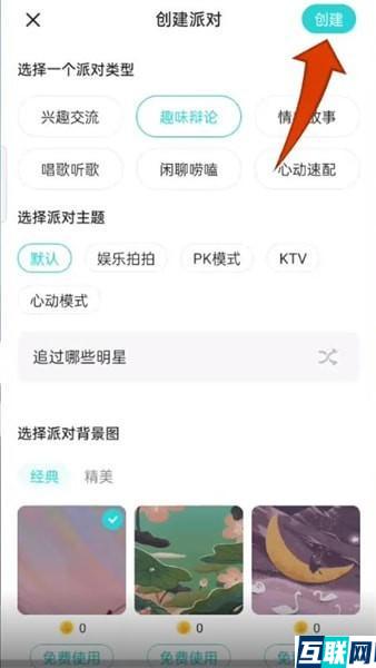 3. 选择派对类型和派对主题,点击【创建】就可以了。