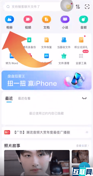 1. 想要免费扩容的话,首先打开百度网盘app,点击首页相册选项,