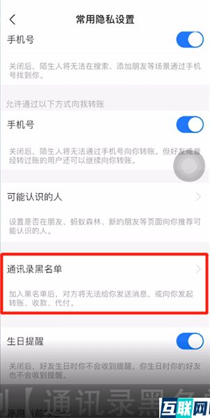 2. 进入设置页面后,找到【隐私】选项,点击并进入,接着点击【常用隐私设置】选项,找到【通讯录黑名单】,