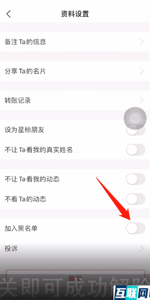 4. 最后点击【加入黑名单】右侧按钮,关闭开关即可成功解除黑名单。