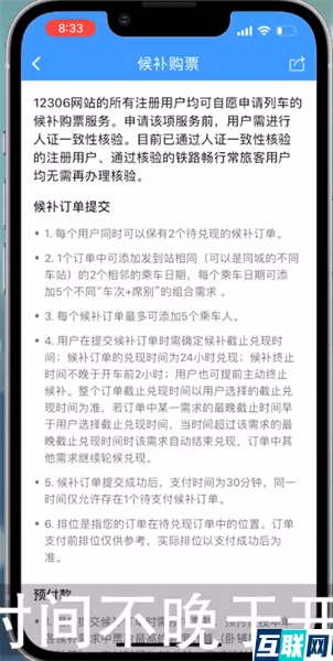 1. 不同购票软件关于候补票数量的要求不同,这里以12306为例:在12306APP中每个用户可以保有2个待兑现订单,其中可以添加始发站和目的地相同(可以是同城不同站)的2个相邻的乘车日期,每个日期可添加5个不同“车次+席别”的组合需求,所以每个用户同天可以候补5张车票,并且,用户提交候补订单时需要确定候补截止的兑现时间,候补订单的时间为24小时兑现,候补终止时间不晚于开车前2小时,用户自己也可以提前终止候补。