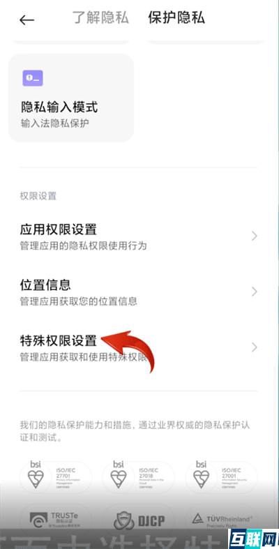 1. 2.在隐私保护中选择保护隐私的设置栏,再在该页面中选择特殊权限设置。