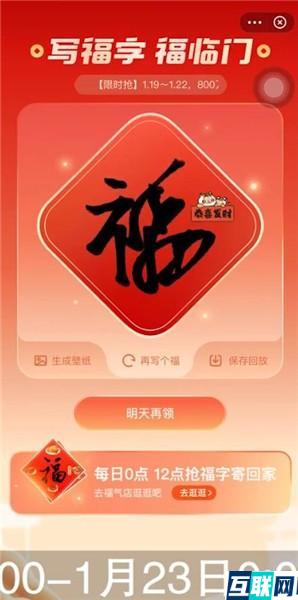 1. 1月19日0:00-1月23日0:00活动期间用户进入【福气店】-【免费打印福字】版块,有机会用自己手写的福字免费抢打印的纸质福字贴,包邮寄送到家,每天两场分别为0点和12点,每场新春限量特供,抢完即止,活动期间总计800万份免费打印福字名额。
