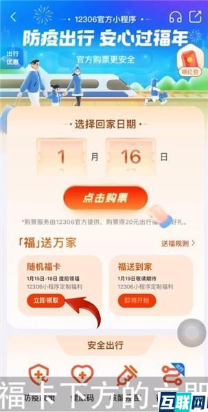 2. 接着点击上方的【12306官方购票更安全】活动,进入12306官方小程序页面,此时就可以看到【福送万家】活动,点击【随机福卡】下方的【立即领取】按钮,