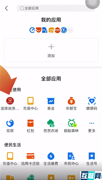1. 1.想要查询婚姻状况的话,首先打开支付宝app,在首页我的应用内点击国家政务服务平台小程序,