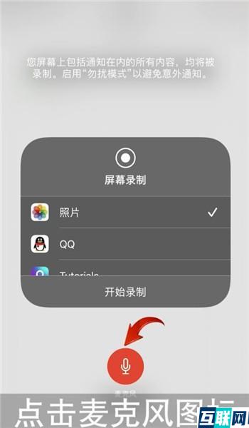 2. 接着下拉打开【控制中心】栏,长按【屏幕录制】按钮,再点击下方的【麦克风】图标,使麦克风显示为开状态,点击【开始录制】按钮,