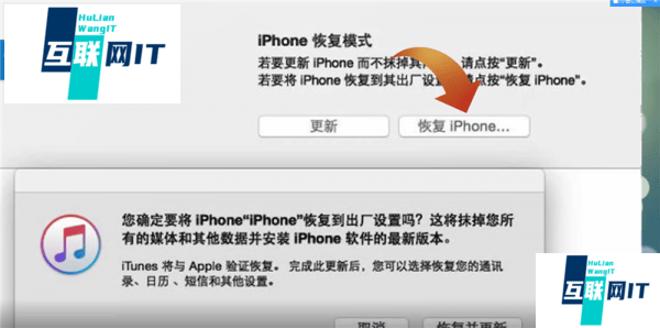 3. 3.然后在iTunes的弹窗上,点击选择恢复iPhone,恢复完成再开机,这时手机即可成功解锁。