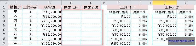 如下图所示,在D列计算提成比例:根据工龄年数在右边两个提成比例对应表里查找相应的提成比例。