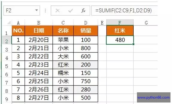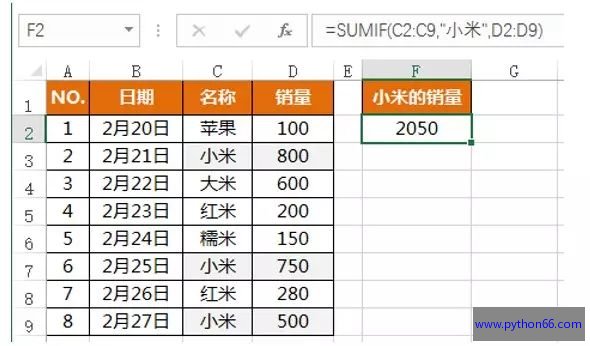 =SUMIF(C2:C9,"小米",D2:D9)