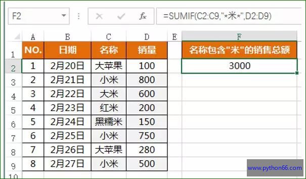 =SUMIF(C2:C9,"*米*",D2:D9)