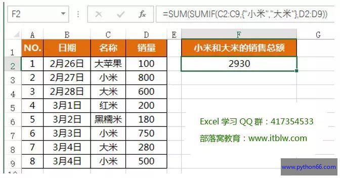=SUM(SUMIF(C2:C9,{"小米","大米"},D2:D9))