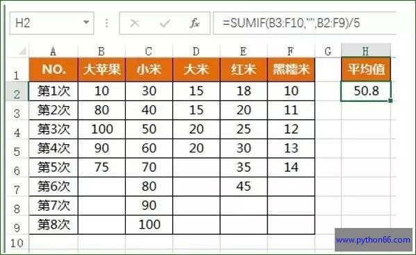 =SUMIF(B3:F10,"",B2:F9)/5