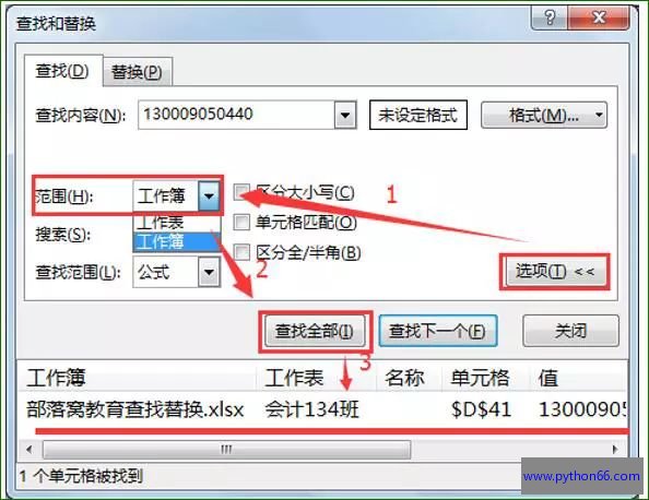 出现对话框后选择“选项”→将范围设置为”工作簿”→”查找全部”,则可以在整个工作簿的范围内查找想要查找的内容啦。