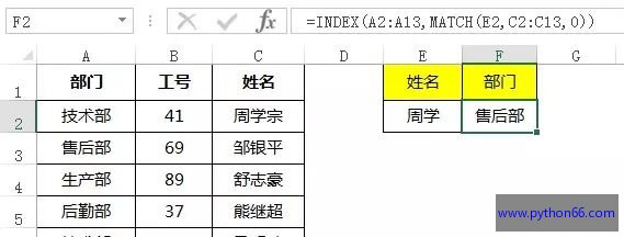 第二,我们在看A2:A13单元格区域中第6行值是多少?答案是:售后部。这正是我们所需要的结果。