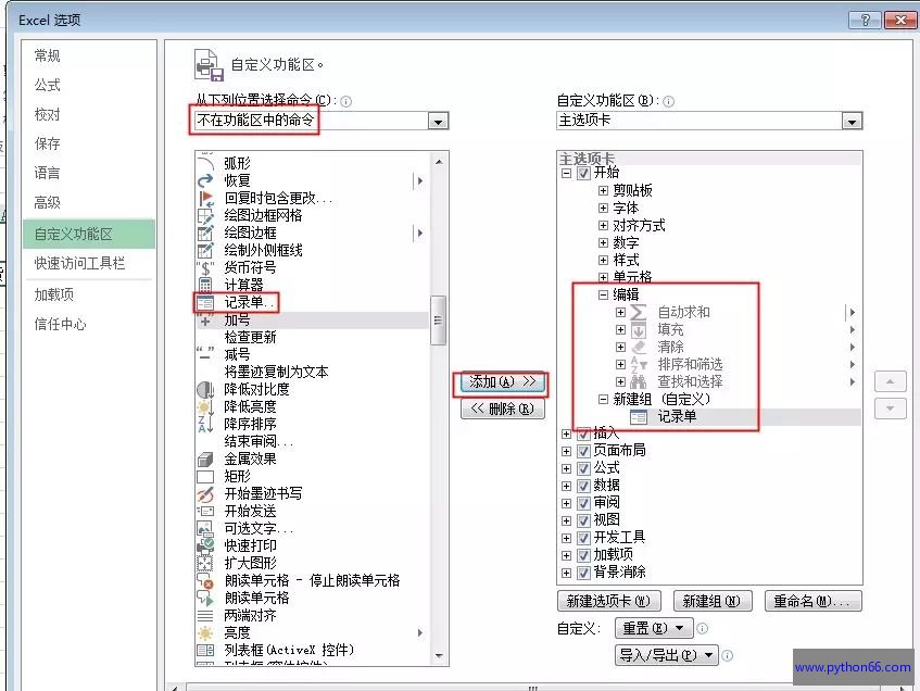 执行“文件——选项”,打开“EXCEL选项”框,根据下面截图设置,将记录单添加到一个“新建组”里面。新建组还可以重命名。