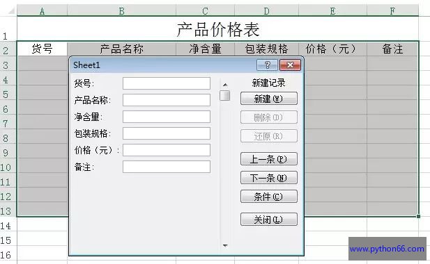 比如我们需要在“产品价格表”中输入数据。在打开的“记录单”对话框里,我们可以方便的对每一个记录进行输入。