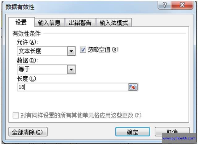 通常,身份证号码固定为18位,而在输入身份证号码的时候,太多数字串看起来很费劲,难免出现错误。这时候我们可以用“数字有效性”来限制数字个数必须是多少位,当多余或者少于限定个数时即提醒输入有误。