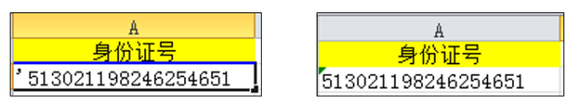 在输入身份证号码时,在号码前面加上一个英文状态下的单引号“'”,其作用就是将该单元格属性设置为“文本”。即可让身份证号码完全显示出来,(该单引号在确认后是不会显示出来的),如下图所示。