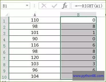 再加个条件,升华一下。我们将A列的数据最后一位提取出来放在B列,并且最后一位如果是0,就显示为10,其他保持最后一位不变。