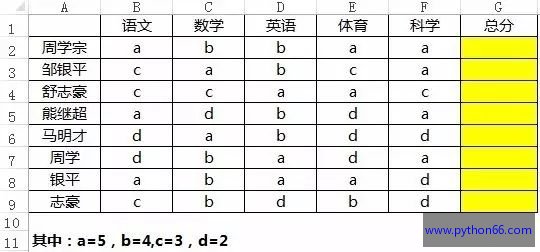 现在学校期中水平测试,都不允许直接打分,只能按等级来综合评定。A等为5分,B等为4分,C等为3分,D等为2分。现在需要统计每个学生的总分。比如“周学宗”的总分应该为:23分。