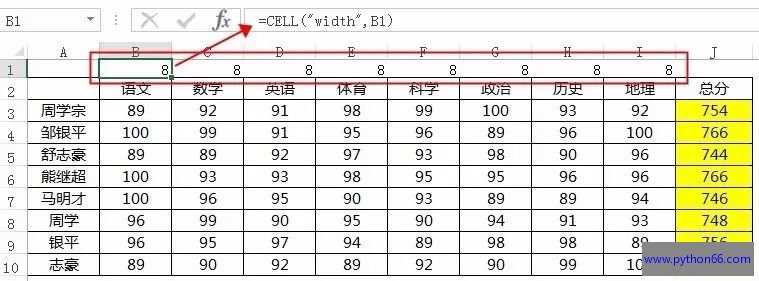 第一步:增加辅助列。在数据源最上面插入一行,然后在B1:I1单元格区域按下CTRL+回车批量输入公式:=CELL("width",B1)。