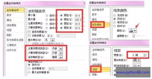 7. 选中纵坐标轴,右键-【设置坐标轴格式】-最小值设为10,最大值设为105,主要与次要刻度单位都设置成10.【主要刻度线类型】选内部,【次要刻度线类型】选外部。坐标轴标签使用默认选项轴旁即可。