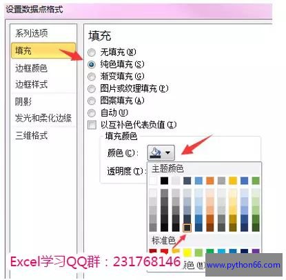 5. 单击一次橙色柱子,再单击一次行政部的橙色柱子,右键-【设置数据点格式】-【填充】-【纯色填充】-选择一个颜色,同理设置其他几个部门的橙色柱子。
