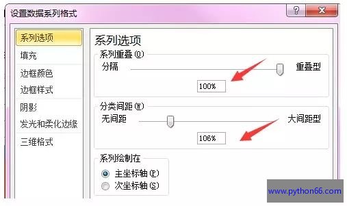 2. 选中蓝色柱子,右键-【设置数据系列格式】-【系列选项】-【系列重叠】-100%,【系列间距】106%