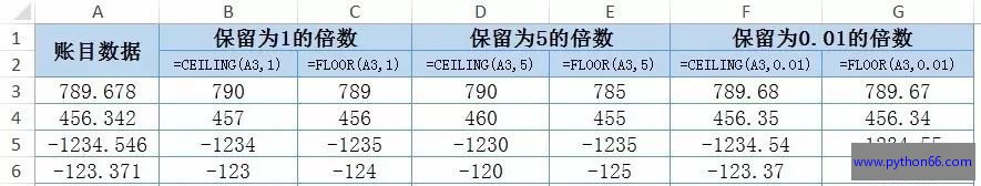 CEILING、FLOOR按照第二参数的整数倍数来处理。比如第二参数为1,表示保留到1的倍数,也就是保留到整数。如果要把第二参数设置为5,即处理后的数值保留为5的倍数。