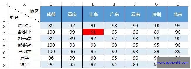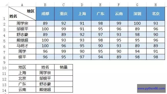 先看规律,姓名在姓名列表中的第几位,就是向下移动几行,地区在地区列表的第几位,就是向右移动几列。