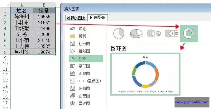 第一, 选择A1:B8单元格区域,插入——饼图——圆环图。