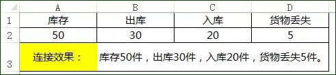 B3单元格公式为:="库存"&A2&"件"&","&"出库"&B2&"件"&","&"入库"&C2&"件"&","&"货物丢失"&D2&"件"&"。"