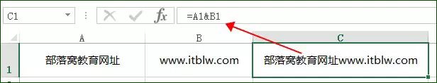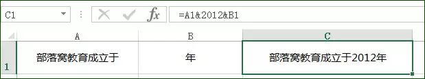 如A1单元格内容为:部落窝教育成立于,B2单元格内容为:年,要显示出C1的单元格效果,可以使用公式:=A1&2012&B1