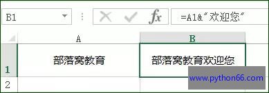 如A1单元格内容为:“部落窝教育”,需要在B1单元格呈现内容“部落窝教育欢迎您”,B1单元格公式为:=A1&"欢迎您"