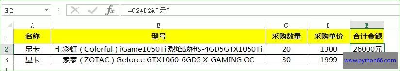 最后,再来一个Excel函数公式连接字符串的真实场景:E2单元格进行合计的时候,需要加上单位元,公式为:=C2*D2&"元"。