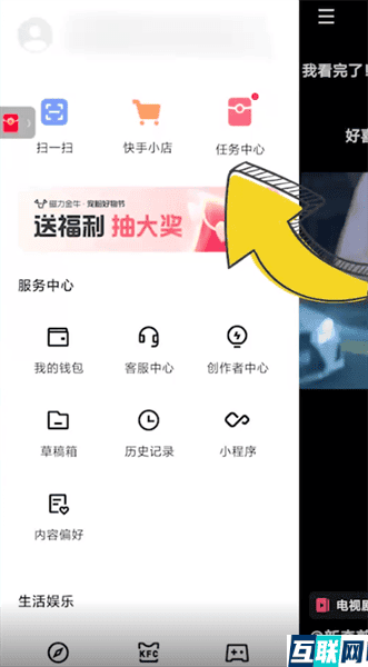 1. 首先进入快手,点击页面左上角三条横线,点击【任务中心】,
