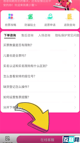 2. 如果门票没有显示不支持退,先进入大麦,点击右下角【我的】,点击【在线客服】,点击底部文本框,输入并发送退票,选择对应的门票,即可完成退票。