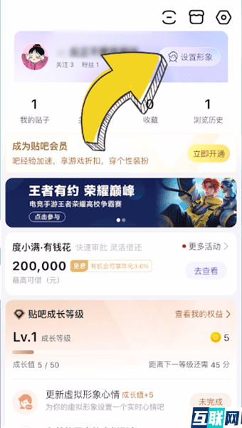 1. 首先打开百度贴吧app,点击右下角【我的】进入个人页面,点击昵称右侧的【设置形象】,