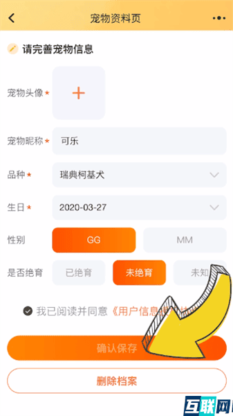 3. 完善宠物信息,勾选同意协议,点击【确认保存】就可以了。