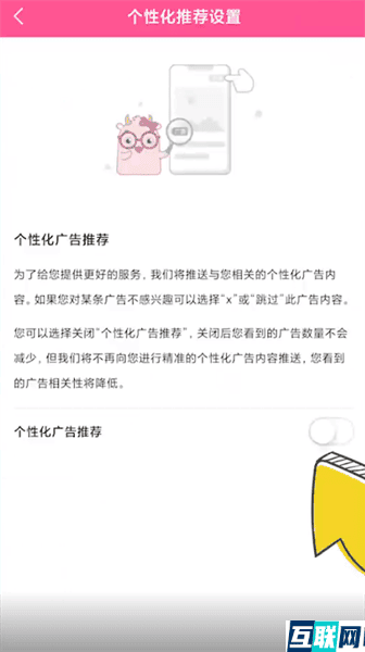 2. 点击页面右上角设置图标,选择【个性化推荐设置】,滑动右侧按钮关闭个性化广告推荐就可以了。