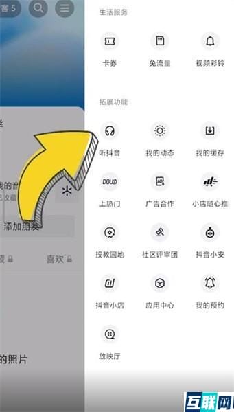 2. 点击右上角三条横线,点击底部【更多功能】,选择【听抖音】,