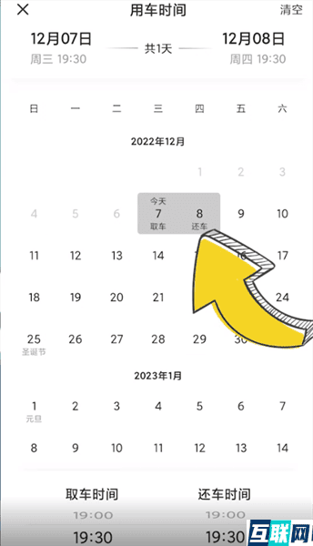 2. 点击取车的日期,选择取车的具体时间,再点击还车的日期,选择还车的具体时间,