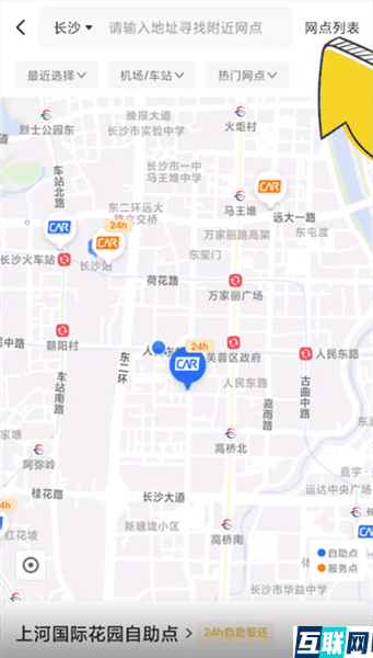 3. 点击下方【确定时间】,点击【取还车网点】进入,点击页面右上角【网点列表】,