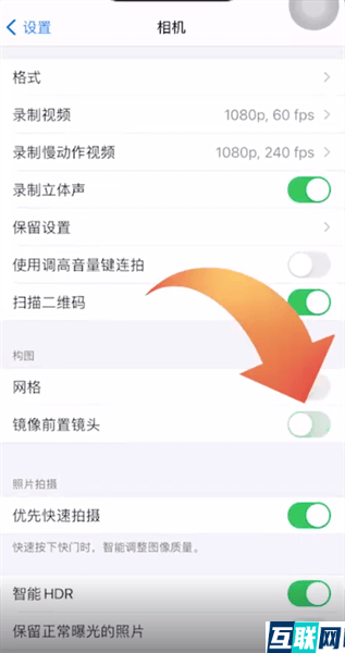 2. 进入相机页面后,找到“镜像前置镜头”,接下来滑动按钮关闭镜像功能就可以了。